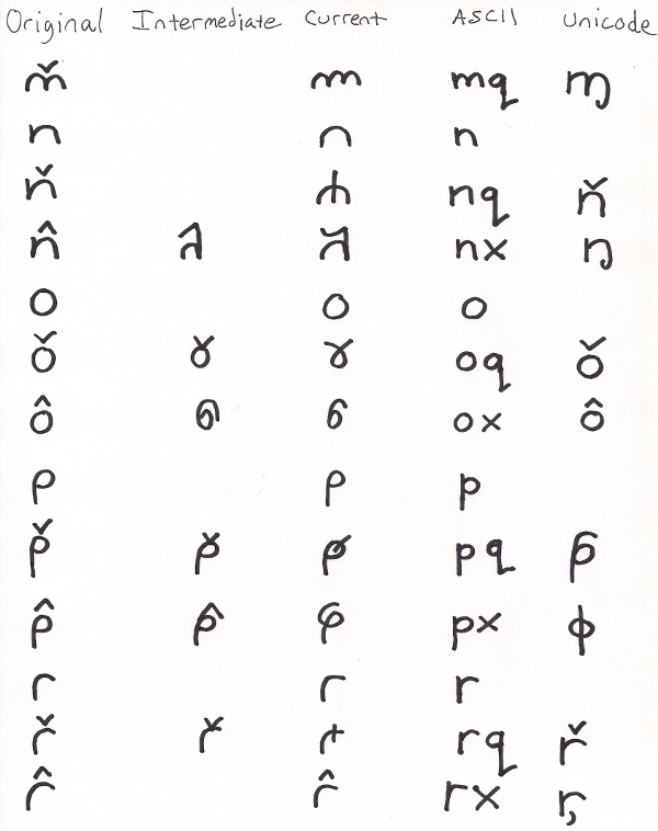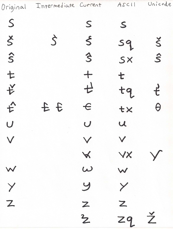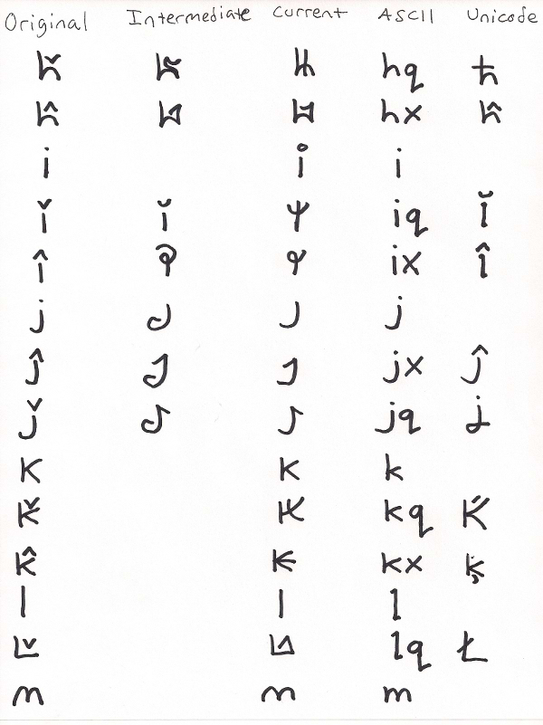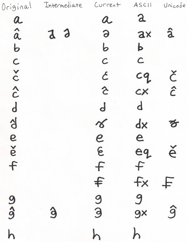 My earliest handwritten alphabet used a circumflex for the letters represented with an x-digraph and a caron or haček for the letters represented with a q-digraph. Later on these letters mutated as in rapid writing I merged the accent mark and the letter into a single glyph.