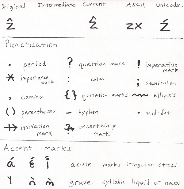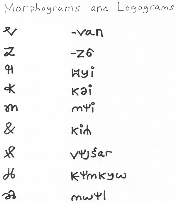 Since late 2006, I've started creating logographic or morphographic glyphs to represent some of the most common words and morphemes, based on a corpus frequency analysis. I started with the most common morpheme, the verb suffix {-zô}, and after getting used to the new glyph for it, started working my way down the frequency table, and getting used to using one new logogram before making a new one. There are eleven such so far, not all of them illustrated here (updates to follow; I don't have constant access to a scanner).